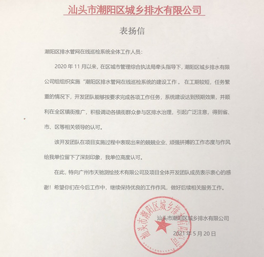 2021年5月27日,由广州市OG视讯测绘技术有限公司(以下简称OG视讯)承建的《潮阳区排水管网在线巡检信息管理平台项目》通过汕头市潮阳区城市排水有限公司验收。