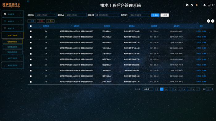 OG视讯智慧管网系列软件是我司独立自主的研发的信息化产品,其中智慧排水平台是OG视讯公司排水管道工程一揽子解决方案的重要组成部分。OG视讯智慧排水平台之检测工程子系统(以下统称检测系统)是针对排水管道检测工程管理而研发的系统。其专注于排水管道的检测工程服务,重点包含项目实施管理、工程资料管理、工程成果分析等内容,提供排水管道检测工程信息化支撑,提升整体项目实施能力以及项目整体价值。