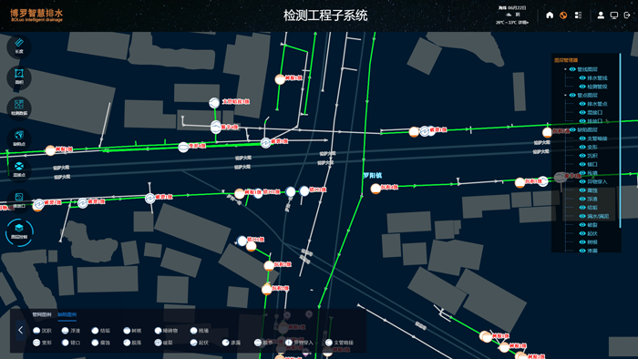 检测系统地图管理将工程数据通过符号化制作展示在地图当中,其中包含基础地图底图数据、工程数据(基础管线与管点、检测管段、管道缺陷、排放口、管道混接口)等资料。各类数据均拥有独立的图层,用户可根据需求使用图层控制器对地图数据进行显隐控制,达到方便用户自由控制地图要素的目的。