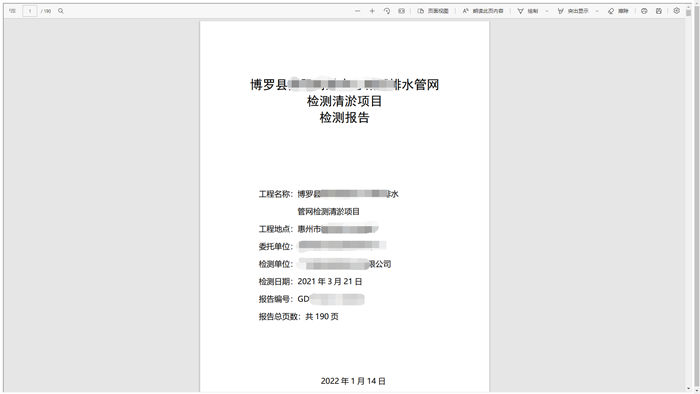 检测系统拥有检测管道数据分析管理模块,能快速高效地处理检测管道入库数据,并提供成果数据分析。检测系统的数据分析管理涵盖工程工作量分析、河涌排放口分析、缺陷类别与等级分析、道路级缺陷点分析、检测成果报告、缺陷分布等整体情况分析。通过分析成果数据全面掌握工程实施状况,全面了解项目实施的进度及质量情况。